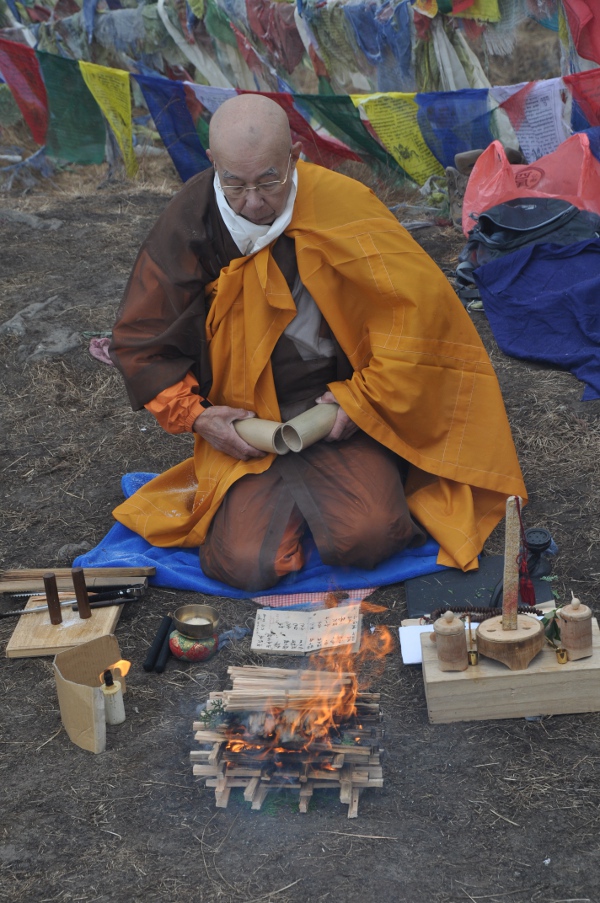On Anapurna base Camp Gomonshu Miyagi Tainen performing the most secret fire ritual of Shugendo: hashiramoto-goma