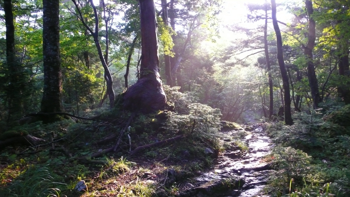 Un peu en contre bas, avant Ozasa-no-yado, se trouvait sur les pentes du Mt Sanjo, un autre endroit où était vénéré les trente-six Kongo-Dôji (36 enfants du vajra). Il y avait un gîte et un temple. L’endroit s’appelait : «kawa-ai-no-yado», un haiku y est rattaché : «Rokkon no gyakuto kiru oya sato suran kari no yado rini nani todomubéki » (les hôtes qui reçoivent l’enseignement sur les six organes des sens et comprennent que ce corps n’est qu’une location, pourquoi garder quelque chose). C’est l’endroit où En-no-gyoja avait projeté le bodhisattva Jizo. On marche ensuite durant deux kilomètres sur un sentier fort agréable. C’est le domaine des biches, daims, sangliers et ours (tsuki-no-waguma), ceux qui portent un V blanc sur l’encolure. On arrive ensuite à la porte sud du Nyonin-kékkai, marqué d’un portique en bois. Fini le terrain plat, la marche souple, on descend dans un vallon.