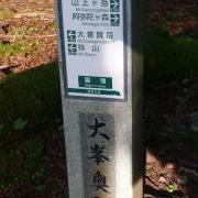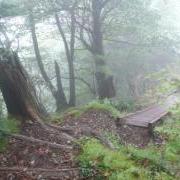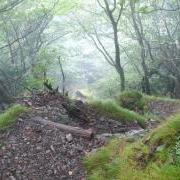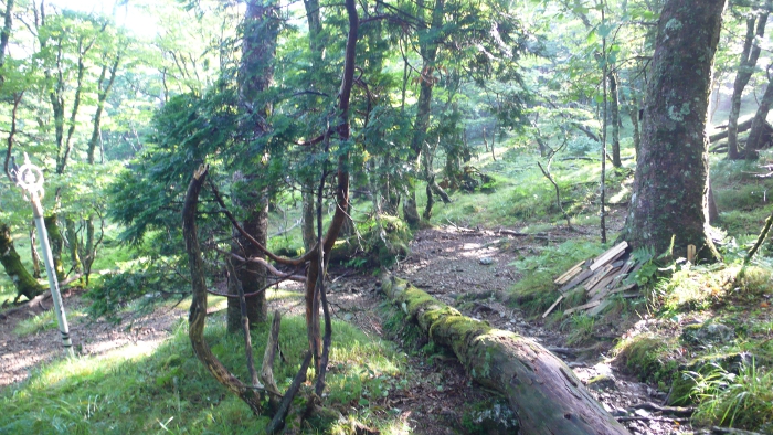 On passe deux goulets et on débouche sur un petit mont : le Ko-Fugen-daké, une trouée pour voir sur la montagne en face et cette toute proche du mont du bodhisattva Fugen (Samanthabarda en scrt). On y laisse une tablette votive et l’on continue à suivre le sentier, passant parfois par des endroits délicats jusqu’au n° 63. Il y a ensuite à cinq de marche, un passage délicat faisant face au Grand Mont Dai Fugen-daké.